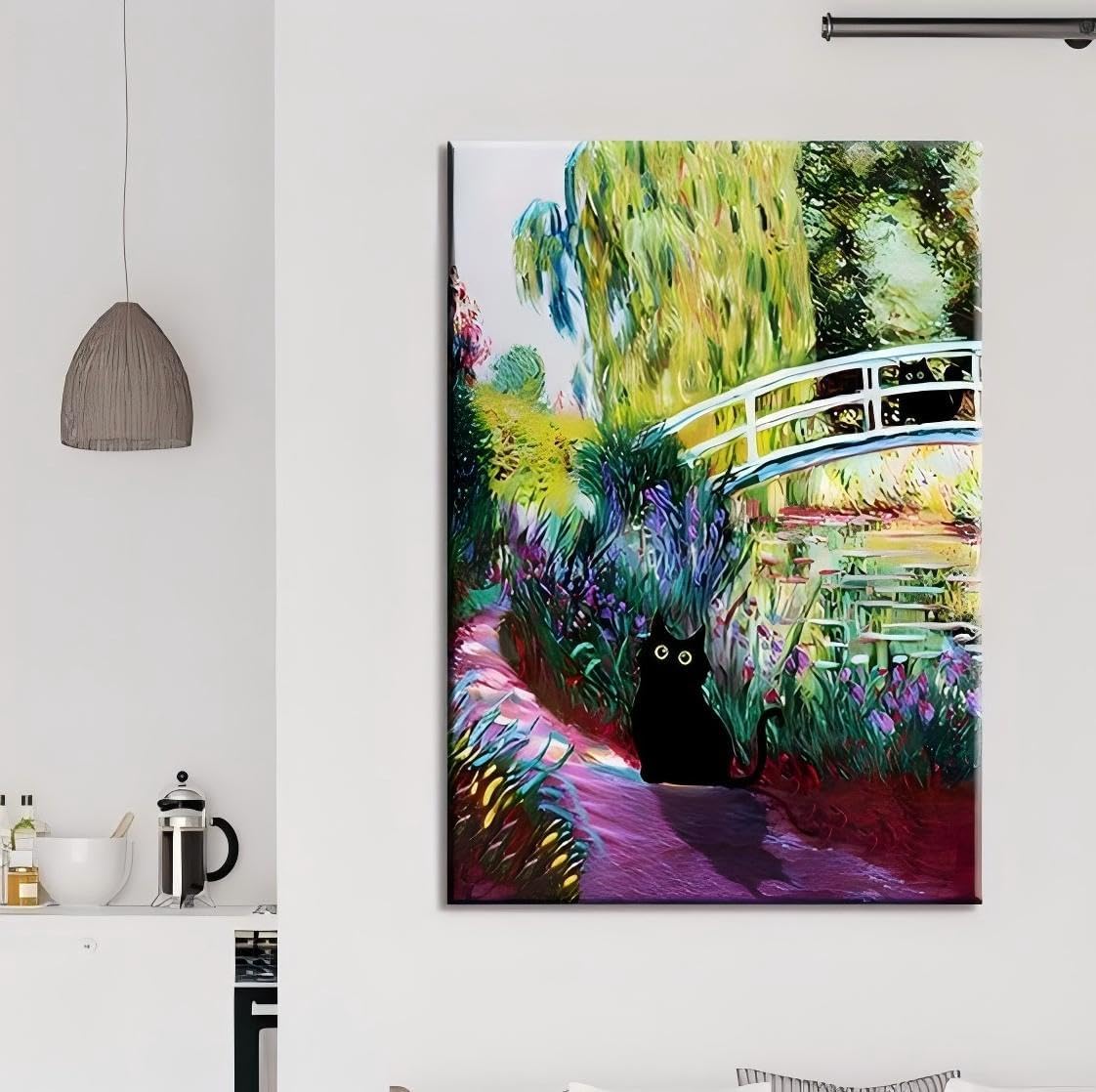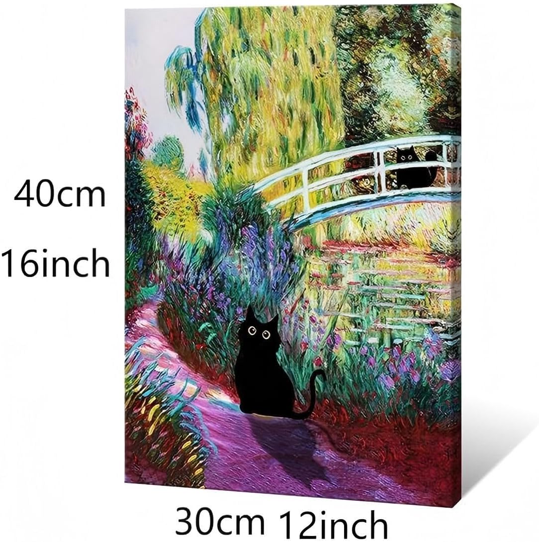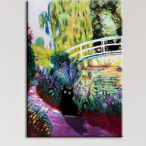 Gwindrise Black Cat Wall Art Painting, Black Cat Garden Bridge Canvas Wall Art, 12×16 inches, Framed, Ready to Hang, Waterproof Print