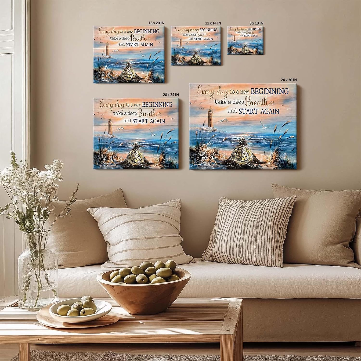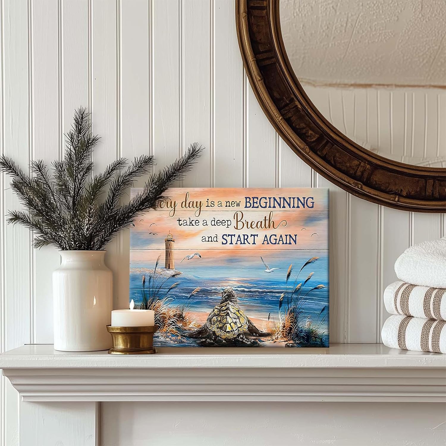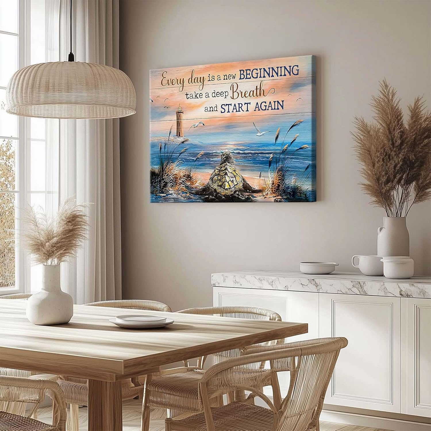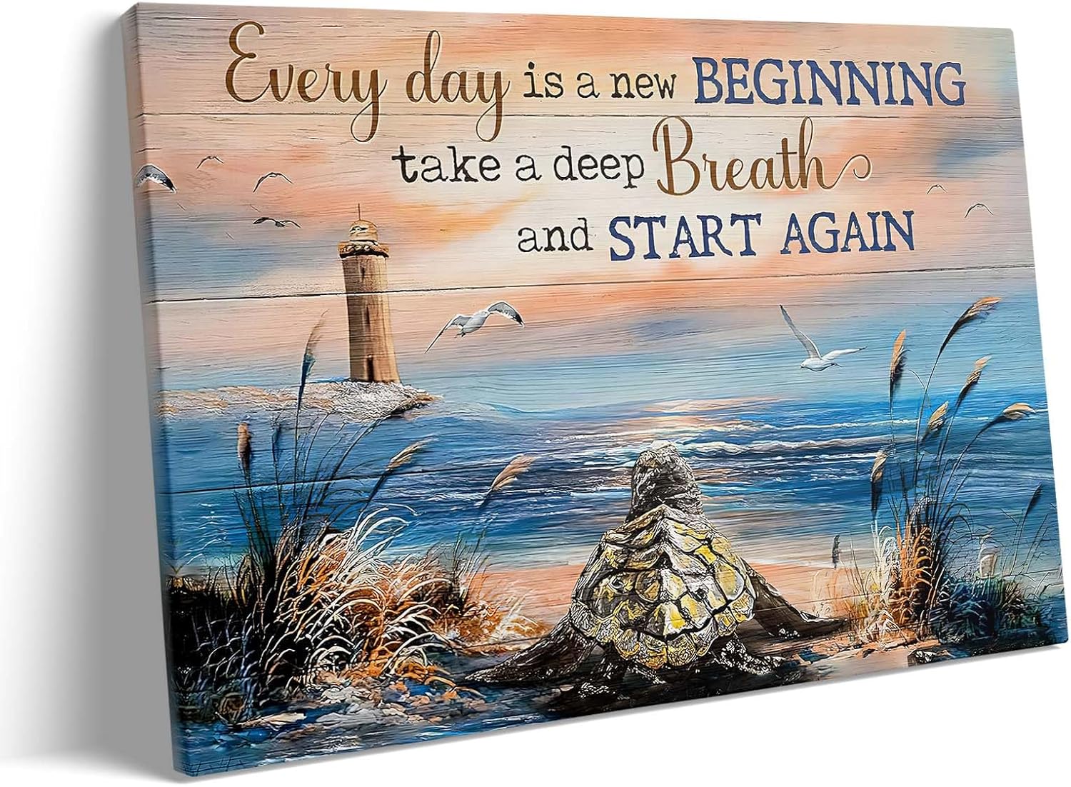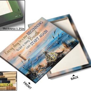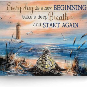 Inspirational Canvas Wall Art, “Every Day is a New Beginning” Motivational Quote Print, Seaside View with Turtle and Lighthouse, Framed Picture Print Wall Art for Living Room and Office 16″ x 20″