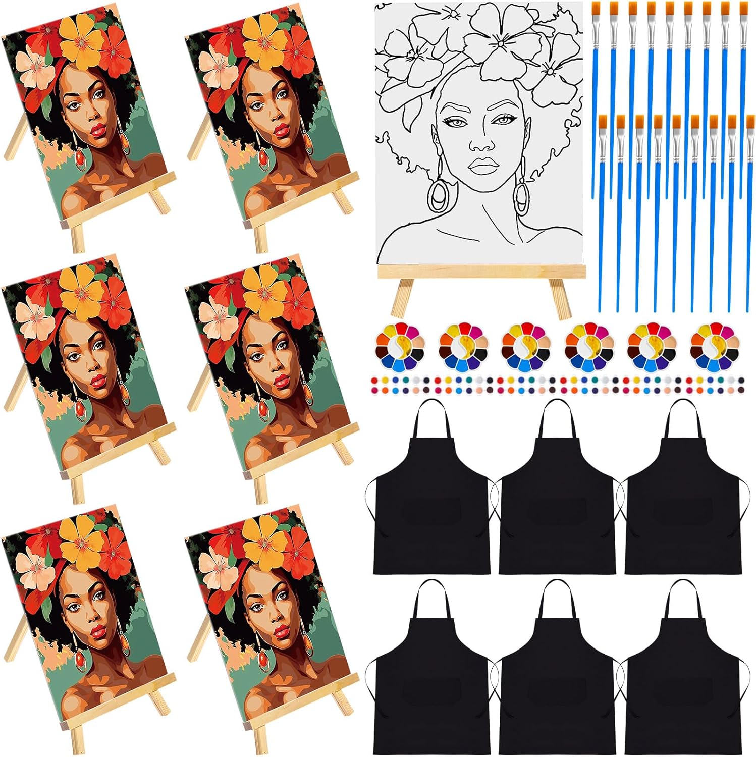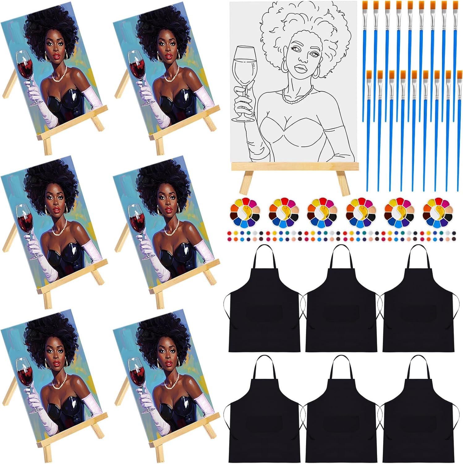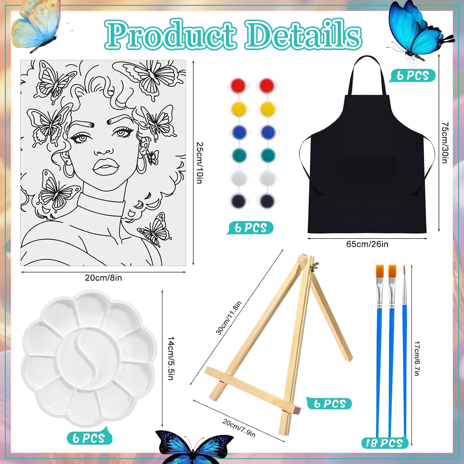 - Package Includes: the sip and paint kit including 6 pieces of butterfly girl canvas paintings about 7.87 x 9.84 inches/ 20 x 25 cm, 6 pieces of apron about 29.53 x 25.2 inches/ 75 x 64 cm, 6 sets of painting tool set, enough to meet your various need; Please note the size information before ordering